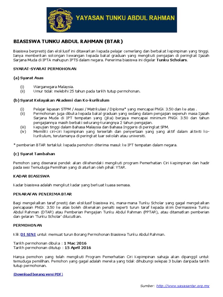 Biasiswa Tunku Abdul Rahman Btar Yayasan Tunku Abdul Rahman